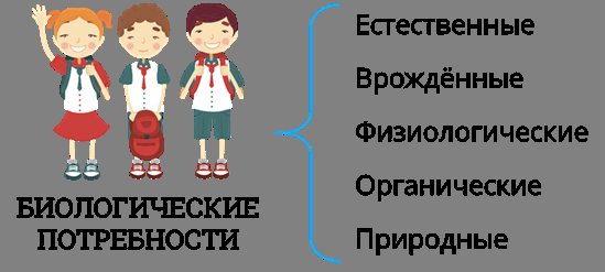 К числу биологических потребностей относят потребность в воздухе, воде, пище, жилище, одежде, сне, отдыхе, физических движениях, тепле и так далее.